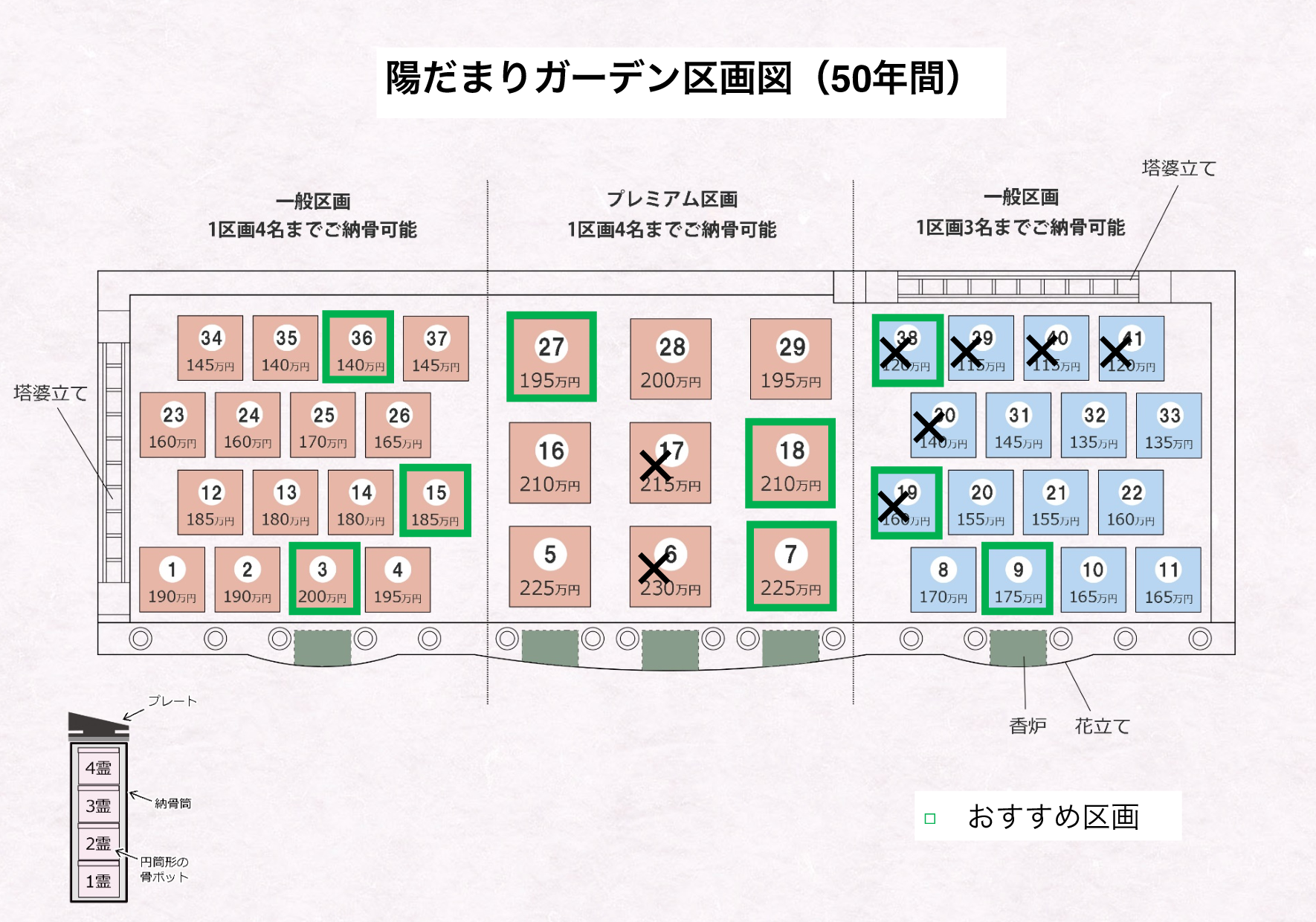 一区画115万円からご利用でき、一区画に3名までご納骨できる区画と4名までご納骨できる区画をご用意しました。